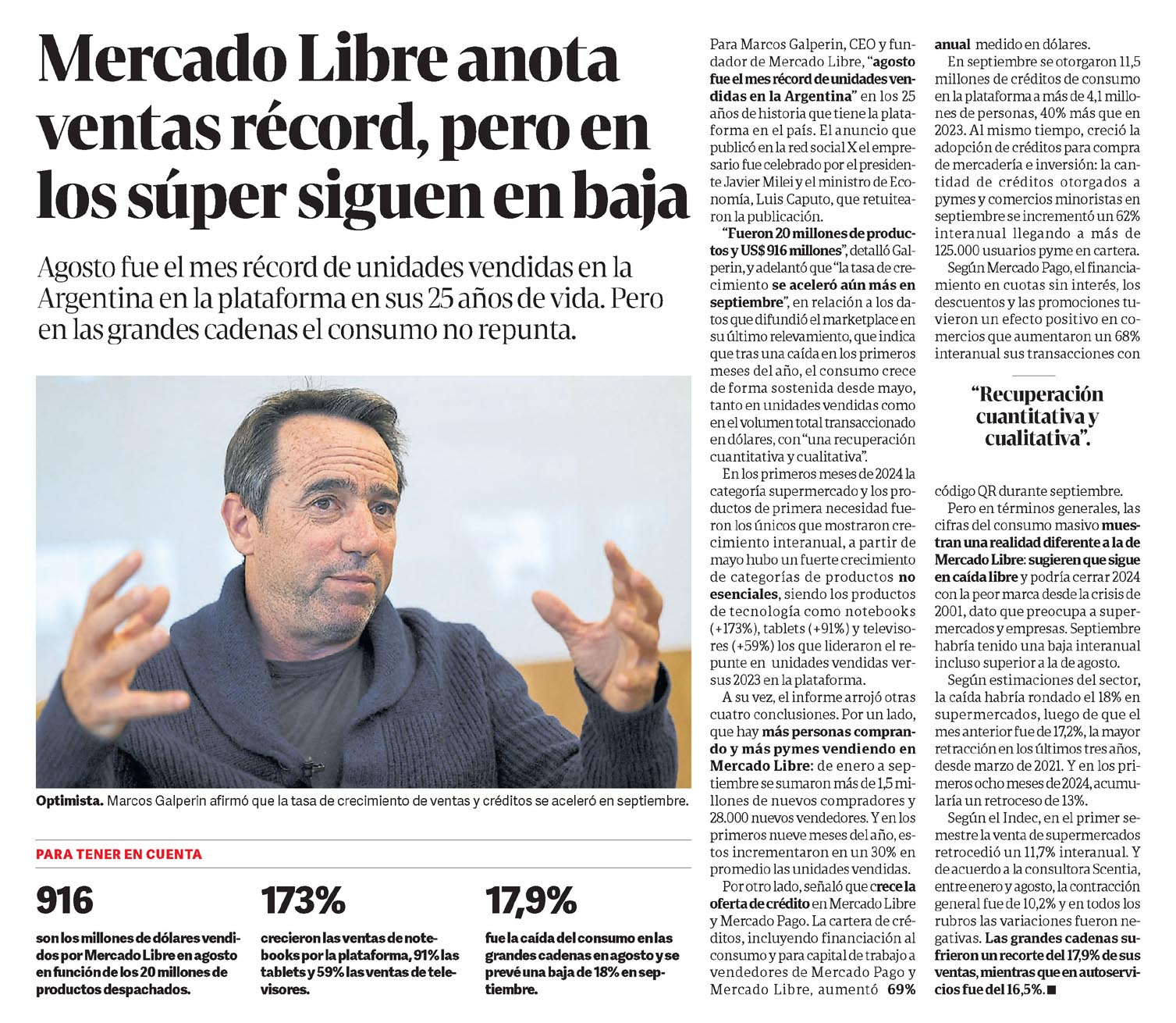 Para Marcos Galperin, CEO y fundador de Mercado Libre, "agosto fue el mes récord de unidades vendidas en la Argentina" en los 25 años de historia que tiene la plataforma en el país. El anuncio que publicó en la red social X el empresario fue celebrado por el presidente Javier Milei y el ministro de Economía, Luis Caputo, que retuitearon la publicación. "Fueron 20 millones de productos y US$ 916 millones", detalló Galperin, y adelantó que "la tasa de crecimiento se aceleró aún más en septiembre", en relación a los datos que difundió el marketplace en su último relevamiento, que indica que tras una caída en los primeros meses del año, el consumo crece de forma sostenida desde mayo, tanto en unidades vendidas como en el volumen total transaccionado en dólares, con "una recuperación cuantitativa y cualitativa". En los primeros meses de 2024 la categoría supermercado y los productos de primera necesidad fueron los únicos que mostraron crecimiento interanual, a partir de mayo hubo un fuerte crecimiento de categorías de productos no esenciales, siendo los productos de tecnología como notebooks (+173%), tablets (+91%) y televisores (+59%) los que lideraron el repunte en unidades vendidas versus 2023 en la plataforma. A su vez, el informe arrojó otras cuatro conclusiones. Por un lado, que hay más personas comprando y más pymes vendiendo en Mercado Libre: de enero a septiembre se sumaron más de 1,5 millones de nuevos compradores y 28.000 nuevos vendedores. Y en los primeros nueve meses del año, estos incrementaron en un 30% en promedio las unidades vendidas. Por otro lado, señaló que crece la oferta de crédito en Mercado Libre y Mercado Pago. La cartera de créditos, incluyendo financiación al consumo y para capital de trabajo a vendedores de Mercado Pago y Mercado Libre, aumentó 69% anual medido en dólares. En septiembre se otorgaron 11,5 millones de créditos de consumo en la plataforma a más de 4,1 millones de personas, 40% más que en 2023. Al mismo tiempo, creció la adopción de créditos para compra de mercadería e inversión: la cantidad de créditos otorgados a pymes y comercios minoristas en septiembre se incrementó un 62% interanual llegando a más de 125.000 usuarios pyme en cartera. Según Mercado Pago, el financiamiento en cuotas sin interés, los descuentos y las promociones tuvieron un efecto positivo en comercios que aumentaron un 68% interanual sus transacciones con código QR durante septiembre. Pero en términos generales, las cifras del consumo masivo muestran una realidad diferente a la de Mercado Libre: sugieren que sigue en caída libre y podría cerrar 2024 con la peor marca desde la crisis de 2001, dato que preocupa a supermercados y empresas. Septiembre habría tenido una baja interanual incluso superior a la de agosto. Según estimaciones del sector, la caída habría rondado el 18% en supermercados, luego de que el mes anterior fue de 17,2%, la mayor retracción en los últimos tres años, desde marzo de 2021. Y en los primeros ocho meses de 2024, acumularía un retroceso de 13%. Según el Indec, en el primer semestre la venta de supermercados retrocedió un 11,7% interanual. Y de acuerdo a la consultora Scentia, entre enero y agosto, la contracción general fue de 10,2% y en todos los rubros las variaciones fueron negativas. Las grandes cadenas sufrieron un recorte del 17,9% de sus ventas, mientras que en autoservicios fue del 16,5%.