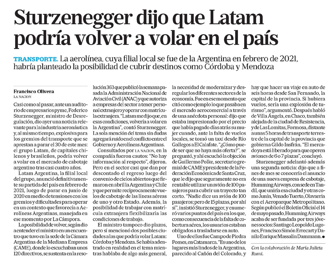 Casi como al pasar, ante un auditorio de empresarios pyme, Federico Sturzenegger, ministro de Desregulación, dio ayer una noticia relevante para la industria aeronáutica y, al mismo tiempo, explosiva para los gremios del transporte que se aprestan a parar el 30 de este mes: el grupo Latam, de capitales chilenos y brasileños, podría volver a volar en el mercado de cabotaje argentino tras casi cuatro años. Latam Argentina, la filial local del grupo, anunció definitivamente su partida del país en febrero de 2021, luego de parar en junio de 2020 en medio de tensiones con los gremios y dificultades para operar en un contexto que favorecía a Aerolíneas Argentinas, manejada en ese momento por La Cámpora. La posibilidad de volver, según dio a entender el ministro en un encuentro que tuvo en la sede de la Cámara Argentina de la Mediana Empresa (CAME), donde lo escuchaban unos 120 directivos, se sustenta en la resolución 363 que publicó la semana pasada la Administración Nacional de Aviación Civil (ANAC) y que autoriza a empresas del sector a tener personal extranjero y operar con matrícula extranjera. "Latam me dijo que, en esas condiciones, volvería a volar en la Argentina", contó Sturzenegger. La sola mención del tema sin dudas agregará ruido en el conflicto entre el Gobierno y Aerolíneas Argentinas. Consultados por la nacion, en la compañía fueron cautos: "No hay información al respecto", dijeron. Pero en el sector casi que dan por descontado el regreso luego del convenio de cielos abiertos que firmaron en abril la Argentina y Chile y que permite recíprocamente vuelos de cabotaje de las líneas aéreas de uno y otro Estado. Además, la posibilidad de trabajar con matrícula extranjera flexibilizaría las condiciones de trabajo. El ministro tampoco dio plazos, pero sí mencionó dos posibles ciudades a las que podría volar Latam: Córdoba y Mendoza. Se había adentrado en realidad en el tema mientras hablaba de algo más general, la necesidad de modernizar y desregular los diferentes sectores de la economía. Fue en ese momento que citó como ejemplo lo que pasaba en el mercado aerocomercial a través de una anécdota personal: dijo que estaba impresionado por el precio que había pagado días atrás su mujer cuando, ante la falta de vuelos locales, se tomó un taxi desde Río Gallegos a El Calafate. "¿Cómo puede ser que no haya más oferta?", se preguntó, y ahí escuchó la objeción de Guillermo Polke, secretario gremial de CAME y presidente de la Federación Económica de Santa Cruz, que le dijo que seguramente no era rentable utilizar un avión de 100 pasajeros para cubrir un trayecto tan corto. "Nadie dice un avión de 100 pasajeros; pero de 15 plazas, por ahí sí", insistió Sturzenegger, y enumeró varios puntos del país en los que, como consecuencia de la falta de cobertura aérea, los usuarios estaban obligados a trasladarse en auto. Uno de ellos fue Campo de Piedra Pomes, en Catamarca. "Es uno de los lugares más lindos de la Argentina, parecido al Cañón del Colorado, y hay que hacer un viaje en auto de seis horas desde San Fernando, la capital de la provincia. Si hubiera vuelos, sería una explosión de turismo", argumentó. Después habló de Villa Ángela, en Chaco, también alejada de la ciudad de Resistencia, y de Las Lomitas, Formosa, distante a unas 5 horas de transporte terrestre de la capital de la provincia que gobierna Gildo Insfrán. "El mercado ya está liberado para que operen aviones de 6 o 7 plazas", concluyó. Sturzenegger adelantó además una segunda noticia: dijo que a fines de mes se conocería el anuncio de una nueva empresa de cabotaje, Humming Airways, con sede en Tandil, que uniría esa ciudad y otras como Junín, Venado Tuerto, Olavarría con el Aeroparque Metropolitano. Según publicó el Boletín Oficial el 14 de mayo pasado, Humming Airways acaba de ser fundada por tres jóvenes socios: Santiago Leopoldo Lugones, Francisco Simón Errecart y Danilo Enrique Massalin Dammann.