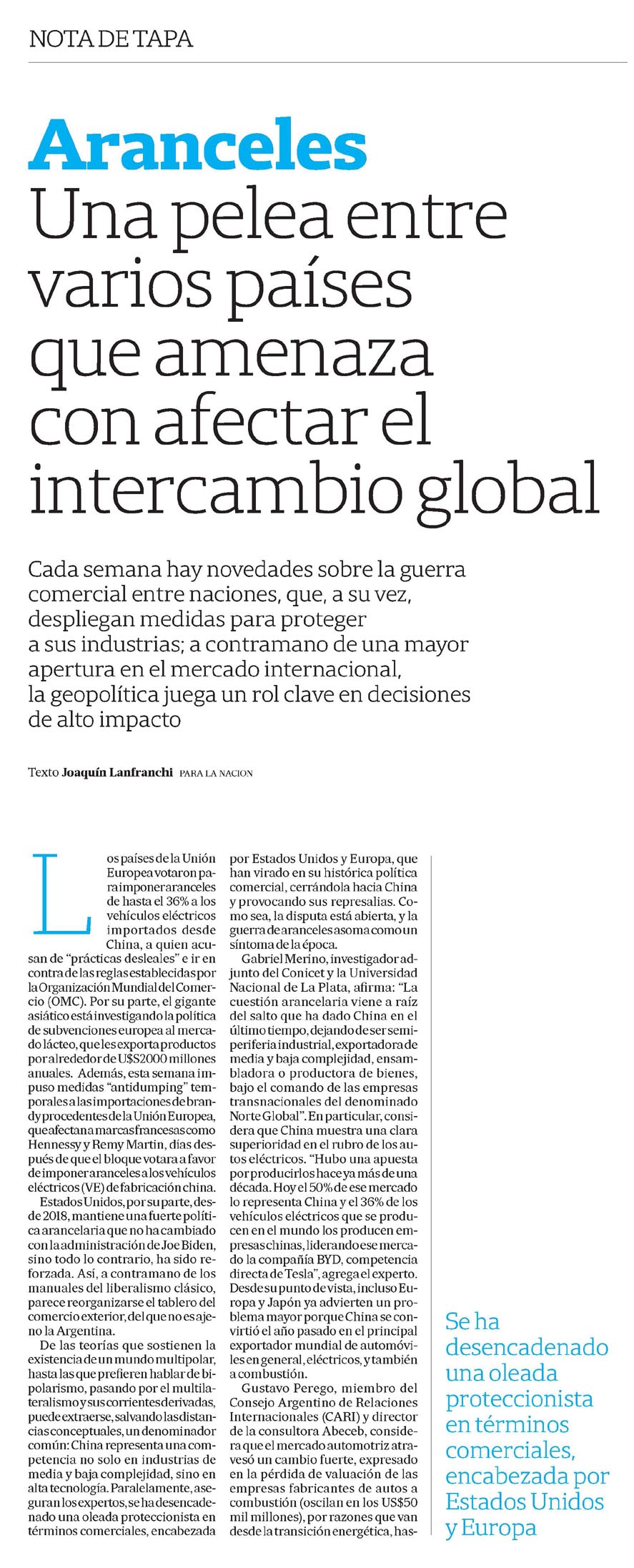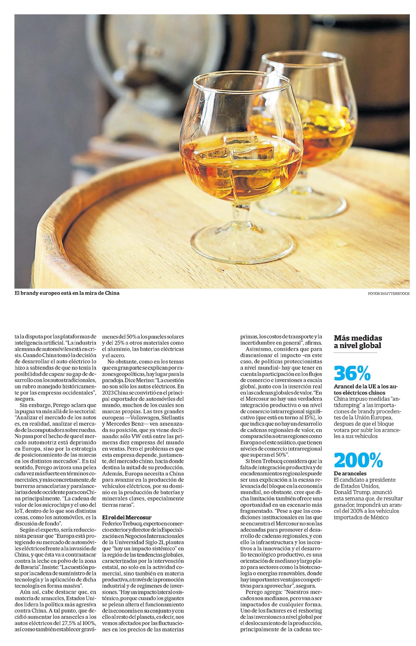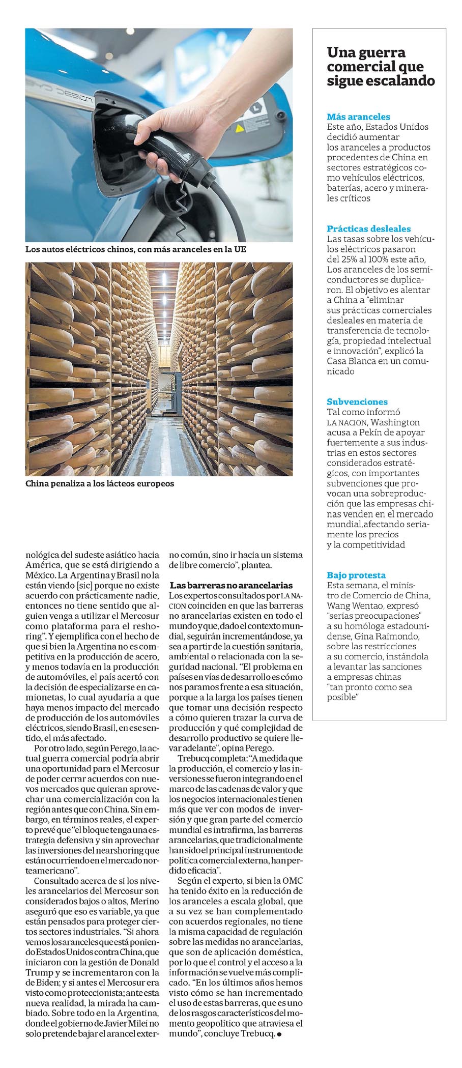Los países de la Unión Europea votaron para imponer aranceles de hasta el 36% a los vehículos eléctricos importados desde China, a quien acusan de "prácticas desleales" e ir en contra de las reglas establecidas por la Organización Mundial del Comercio (OMC). por su parte, el gigante asiático está investigando la política de subvenciones europea al mercado lácteo, que les exporta productos por alrededor de U$S2000 millones anuales. además, esta semana impuso medidas "antidumping" temporales a las importaciones de brandy procedentes de la Unión Europea, que afectan a marcas francesas como Hennessy y remy Martin, días después de que el bloque votara a favor de imponer aranceles a los vehículos eléctricos (VE) de fabricación china. Estados Unidos, por su parte, desde 2018, mantiene una fuerte política arancelaria que no ha cambiado con la administración de Joe Biden, sino todo lo contrario, ha sido reforzada. así, a contramano de los manuales del liberalismo clásico, parece reorganizarse el tablero del comercio exterior, del que no es ajeno la argentina. De las teorías que sostienen la existencia de un mundo multipolar, hasta las que prefieren hablar de bipolarismo, pasando por el multilateralismo y sus corrientes derivadas, puede extraerse, salvando las distancias conceptuales, un denominador común: China representa una competencia no solo en industrias de media y baja complejidad, sino en alta tecnología. paralelamente, aseguran los expertos, se ha desencadenado una oleada proteccionista en términos comerciales, encabezada por Estados Unidos y Europa, que han virado en su histórica política comercial, cerrándola hacia China y provocando sus represalias. Como sea, la disputa está abierta, y la guerra de aranceles asoma como un síntoma de la época. Gabriel Merino, investigador adjunto del Conicet y la Universidad Nacional de la plata, afirma: "la cuestión arancelaria viene a raíz del salto que ha dado China en el último tiempo, dejando de ser semiperiferia industrial, exportadora de media y baja complejidad, ensambladora o productora de bienes, bajo el comando de las empresas transnacionales del denominado Norte Global". En particular, considera que China muestra una clara superioridad en el rubro de los autos eléctricos. "Hubo una apuesta por producirlos hace ya más de una década. Hoy el 50% de ese mercado lo representa China y el 36% de los vehículos eléctricos que se producen en el mundo los producen empresas chinas, liderando ese mercado la compañía BYD, competencia directa de Tesla", agrega el experto. Desde su punto de vista, incluso Europa y Japón ya advierten un problema mayor porque China se convirtió el año pasado en el principal exportador mundial de automóviles en general, eléctricos, y también a combustión. Gustavo perego, miembro del Consejo argentino de relaciones Internacionales (CarI) y director de la consultora abeceb, considera que el mercado automotriz atravesó un cambio fuerte, expresado en la pérdida de valuación de las empresas fabricantes de autos a combustión (oscilan en los US$50 mil millones), por razones que van desde la transición energética, has ta la disputa por las plataformas de inteligencia artificial. "la industria alemana de automóviles está en crisis. Cuando China tomó la decisión de desarrollar el auto eléctrico lo hizo a sabiendas de que no tenía la posibilidad de capear su gap de desarrollo con los autos tradicionales, un rubro manejado históricamente por las empresas occidentales", asegura. Sin embargo, perego aclara que la pugna va más allá de lo sectorial: "analizar el mercado de los autos es, en realidad, analizar el mercado de la computadora sobre ruedas. No pasa por el hecho de que el mercado automotriz está deprimido en Europa, sino por la estrategia de posicionamiento de las marcas en los distintos mercados". En tal sentido, perego avizora una pelea cada vez más fuerte en términos comerciales, y más concretamente, de barreras arancelarias y paralancelarias desde occidente para con China principalmente. "la cadena de valor de los microchips y el uso del IoT, dentro de lo que son distintas cosas, como los automóviles, es la discusión de fondo". Según el experto, sería reduccionista pensar que "Europa está protegiendo su mercado de automóviles eléctricos frente a la invasión de China, y que ésta va a contraatacar contra la leche en polvo de la zona de Bavaria". Insiste: "la cuestión pasa por la cadena de suministro de la tecnología y la aplicación de dicha tecnología en forma masiva". aún así, cabe destacar que, en materia de aranceles, Estados Unidos lidera la política más agresiva contra China. a tal punto, que decidió aumentar los aranceles a los autos eléctricos del 27,5% al 100%, así como también establecer gravámenes del 50% a los paneles solares y del 25% a otros materiales como el aluminio, las baterías eléctricas y el acero. No obstante, como en los temas que en gran parte se explican por razones geopolíticas, hay lugar para la paradoja. Dice Merino: "la cuestión no son sólo los autos eléctricos. En 2023 China se convirtió en el principal exportador de automóviles del mundo, muchos de los cuales son marcas propias. las tres grandes europeas -Volkswagen, Stellantis y Mercedes Benz- ven amenazada su posición, que ya viene declinando: sólo VW está entre las primeras diez empresas del mundo en ventas. pero el problema es que esta empresa depende, justamente, del mercado chino, hacia donde destina la mitad de su producción. además, Europa necesita a China para avanzar en la producción de vehículos eléctricos, por su dominio en la producción de baterías y minerales claves, especialmente tierras raras". El rol del Mercosur Federico Trebucq, experto en comercio exterior y director de la Especialización en Negocios Internacionales de la Universidad Siglo 21, plantea que "hay un impacto sistémico" en la región de las tendencias globales, ca