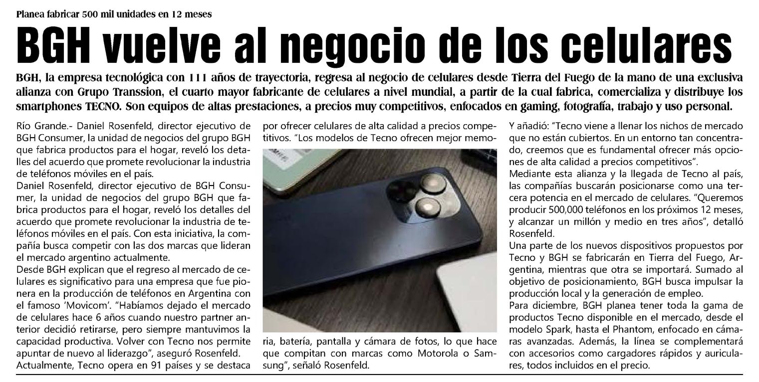 Planea fabricar 500 mil unidades en 12 meses BGH vuelve al negocio de los celulares BGH, la empresa tecnológica con 111 años de trayectoria, regresa al negocio de celulares desde Tierra del Fuego de la mano de una exclusiva alianza con Grupo Transsion, el cuarto mayor fabricante de celulares a nivel mundial, a partir de la cual fabrica, comercializa y distribuye los smartphones TECNO. Son equipos de altas prestaciones, a precios muy competitivos, enfocados en gaming, fotografía, trabajo y uso personal. Río Grande.- Daniel Rosenfeld, director ejecutivo de BGH Consumer, la unidad de negocios del grupo BGH que fabrica productos para el hogar, reveló los detalles del acuerdo que promete revolucionar la industria de teléfonos móviles en el país. Daniel Rosenfeld, director ejecutivo de BGH Consumer, la unidad de negocios del grupo BGH que fabrica productos para el hogar, reveló los detalles del acuerdo que promete revolucionar la industria de teléfonos móviles en el país. Con esta iniciativa, la compañía busca competir con las dos marcas que lideran el mercado argentino actualmente. Desde BGH explican que el regreso al mercado de celulares es significativo para una empresa que fue pionera en la producción de teléfonos en Argentina con el famoso 'Movicom'. “Habíamos dejado el mercado de celulares hace 6 años cuando nuestro partner anterior decidió retirarse, pero siempre mantuvimos la capacidad productiva. Volver con Tecno nos permite apuntar de nuevo al liderazgo”, aseguró Rosenfeld. Actualmente, Tecno opera en 91 países y se destacor ofrecer celulares de alta calidad a precios competitivos. “Los modelos de Tecno ofrecen mejor memo- ria, batería, pantalla y cámara de fotos, lo que hace que compitan con marcas como Motorola o Samsung”, señaló Rosenfeld. Y añadió: “Tecno viene a llenar los nichos de mercado que no están cubiertos. En un entorno tan concentrado, creemos que es fundamental ofrecer más opciones de alta calidad a precios competitivos”. Mediante esta alianza y la llegada de Tecno al país, las compañías buscarán posicionarse como una tercera potencia en el mercado de celulares. “Queremos producir 500,000 teléfonos en los próximos 12 meses, y alcanzar un millón y medio en tres años”, detalló Rosenfeld. Una parte de los nuevos dispositivos propuestos por Tecno y BGH se fabricarán en Tierra del Fuego, Argentina, mientras que otra se importará. Sumado al objetivo de posicionamiento, BGH busca impulsar la producción local y la generación de empleo. Para diciembre, BGH planea tener toda la gama de productos Tecno disponible en el mercado, desde el modelo Spark, hasta el Phantom, enfocado en cámaras avanzadas. Además, la línea se complementará con accesorios como cargadores rápidos y auriculares, todos incluidos en el precio.